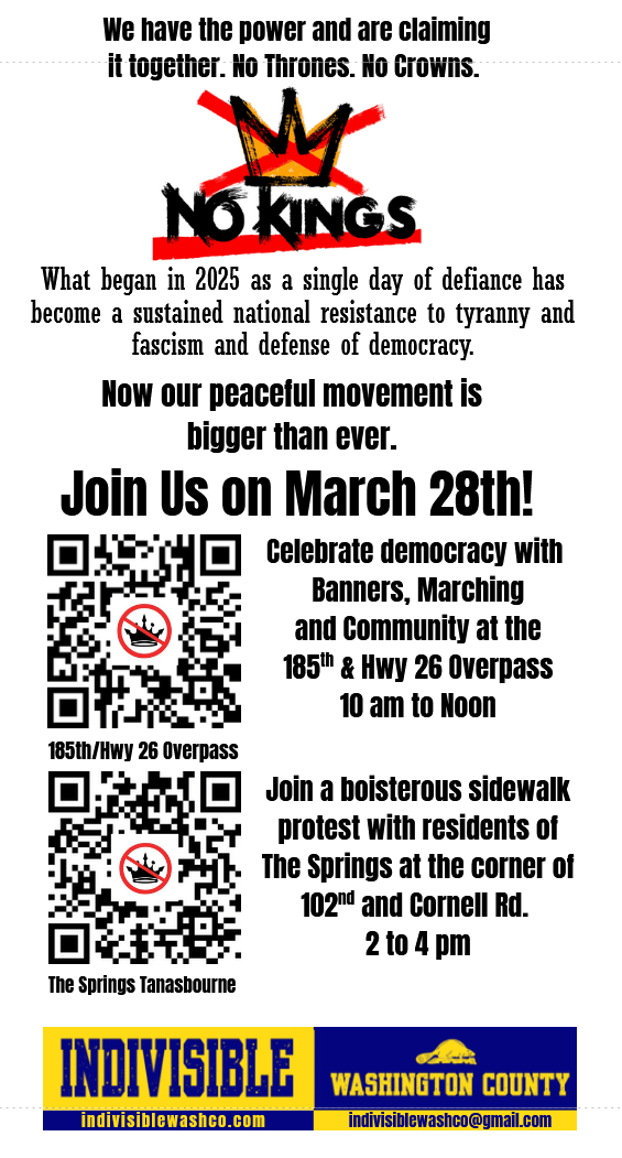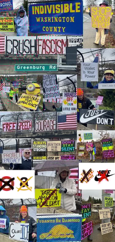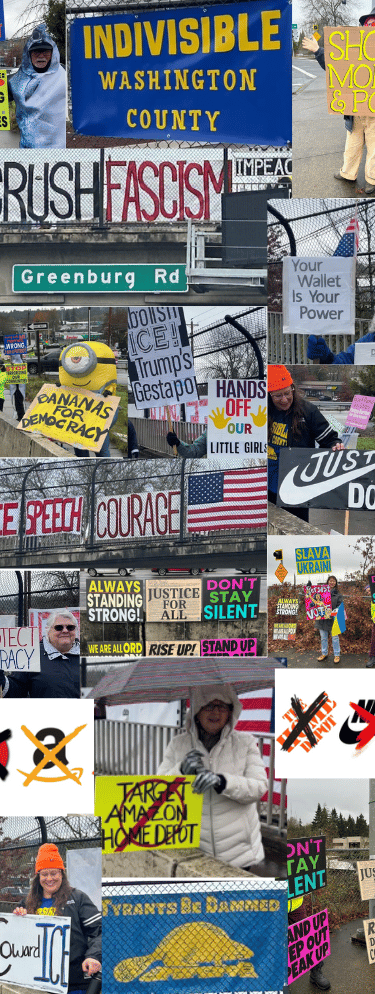 Democracy is not a spectator sport. Join us in direct citizen action to protect our Constitution and the rule of law against attacks by the Trump regime. Come out to one of our events or join us at a community gathering. We are powerful together! We will win back our democracy by incremental change, not through a single action or protest. Get involved as we collaborate with Indivisible and other groups throughout Oregon and the nation.