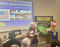 Concerned Citizens of Washington County leader Libby Johnson giving a presentation on the Rule of Law Resolution Project to Indivisible Washington County activists on February 22, 2026