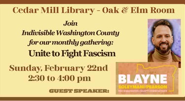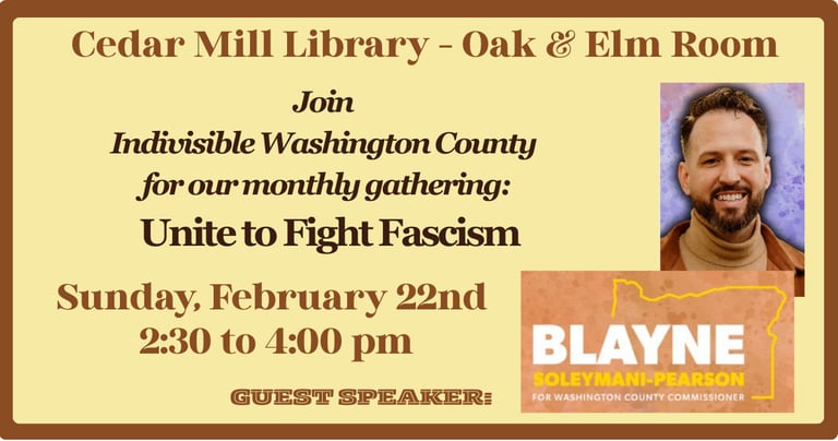We meet at the Cedar Mill Library every Third Sunday to collaborate and work together to defend our democracy and fight against the Trump regime's authoritarian attacks on our Constitution.